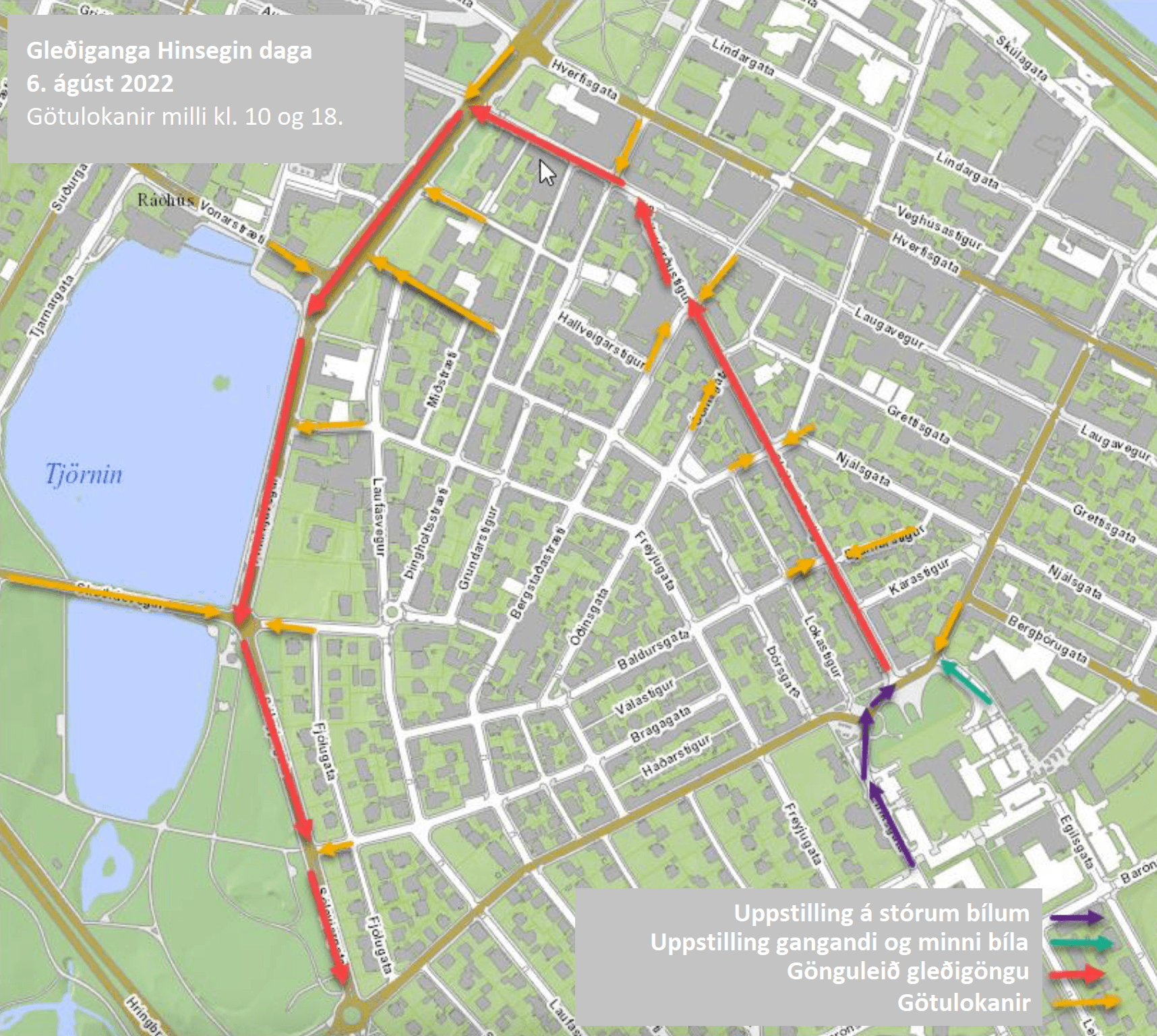 The Reykjavík Pride Parade will start at 14:00 at Hallgrímskirkja. The parade will go down Skólavörðustígur, Bankastræti, Lækjargata, Fríkirkjuvegur and end on Sóleyjagata next to Hljómskálagarðurinn.
