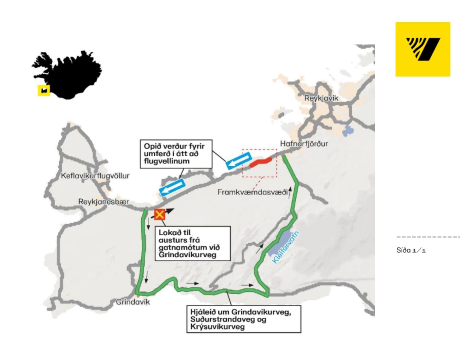 Akstursleiðin frá Keflavík að Hafnarfirði/Reykjavík mun fara hjáleið um Grindavíkurveg (43), Suðurstrandarveg (427) og Krýsuvíkurveg (42) og má búast við að leiðin lengist um allt að 50 mínútur.