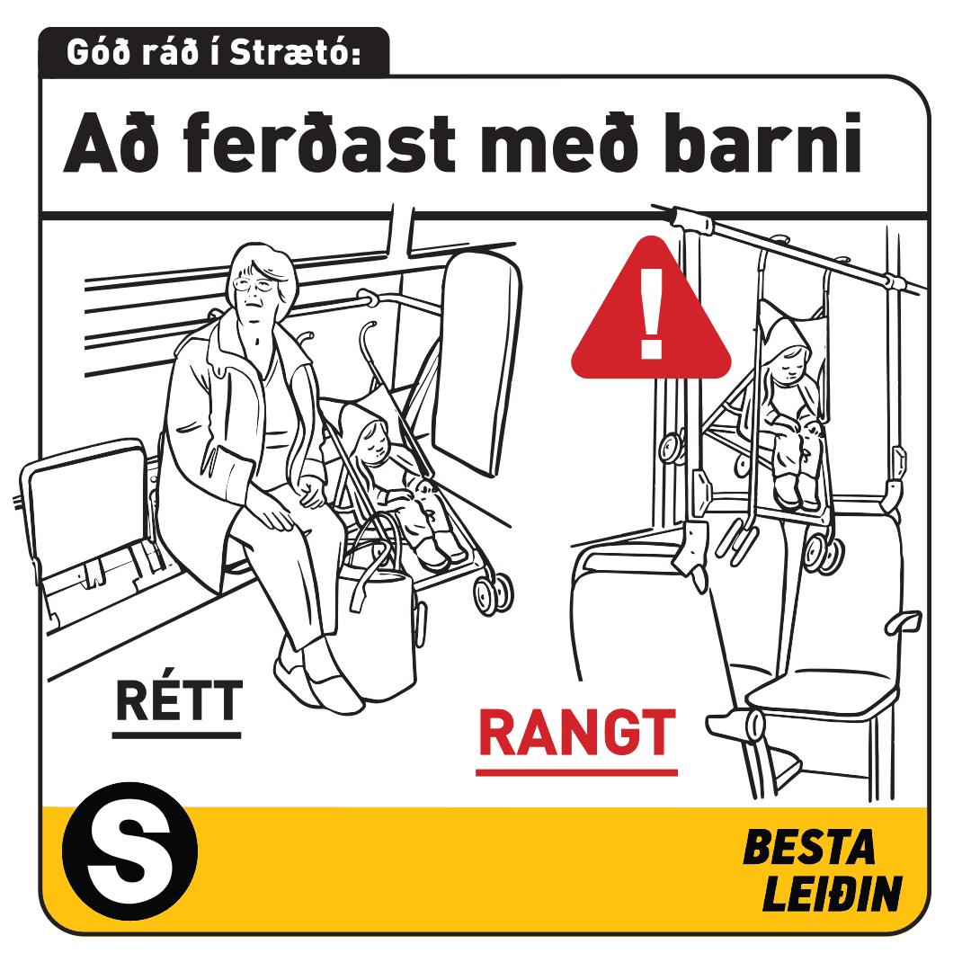Svæði fyrir kerrur og barnavagna er í miðjum vagninum. Mikilvægt er að gæta þess að barnavagninn eða kerran sé vel fest og að barnið sé ekki skilið eftir eitt.