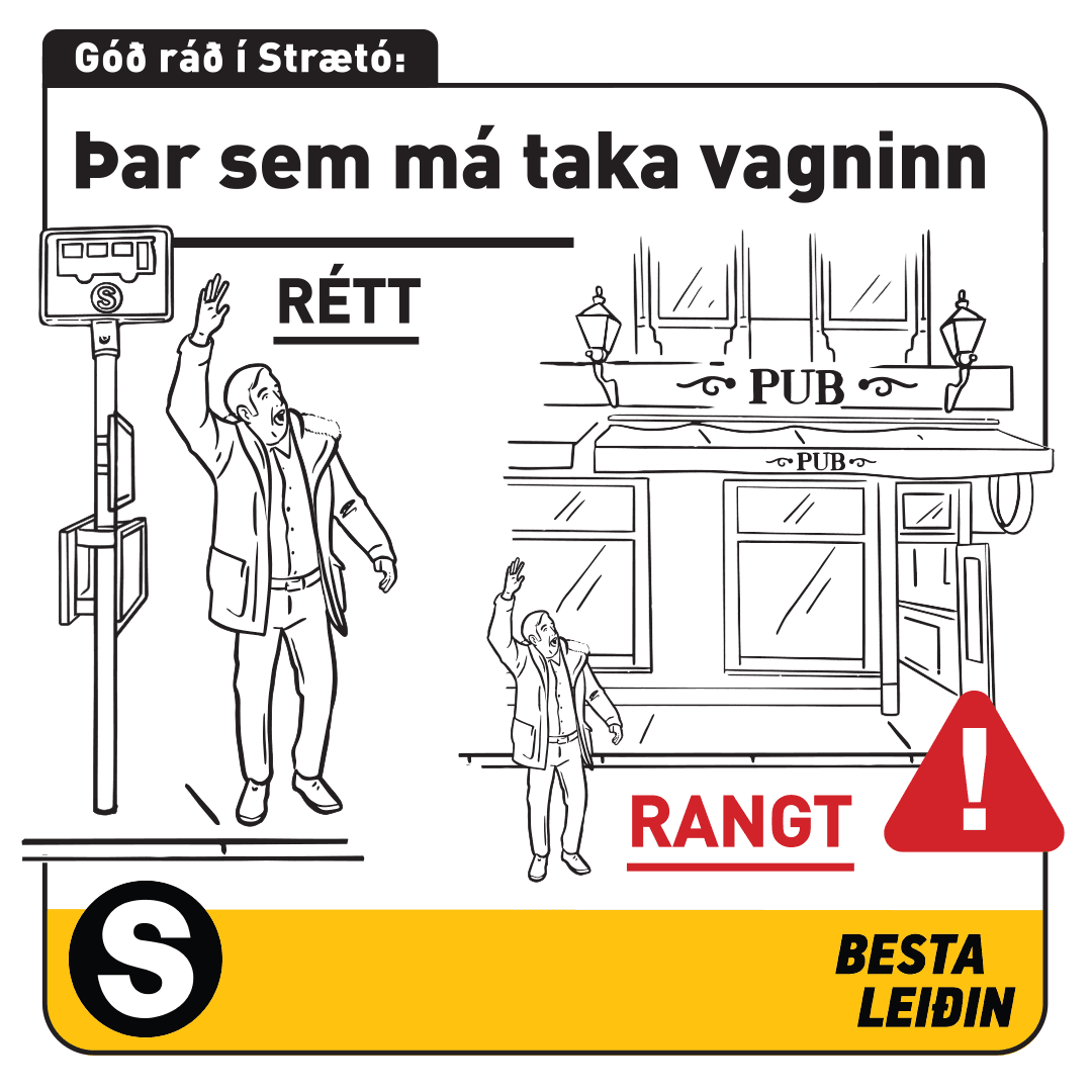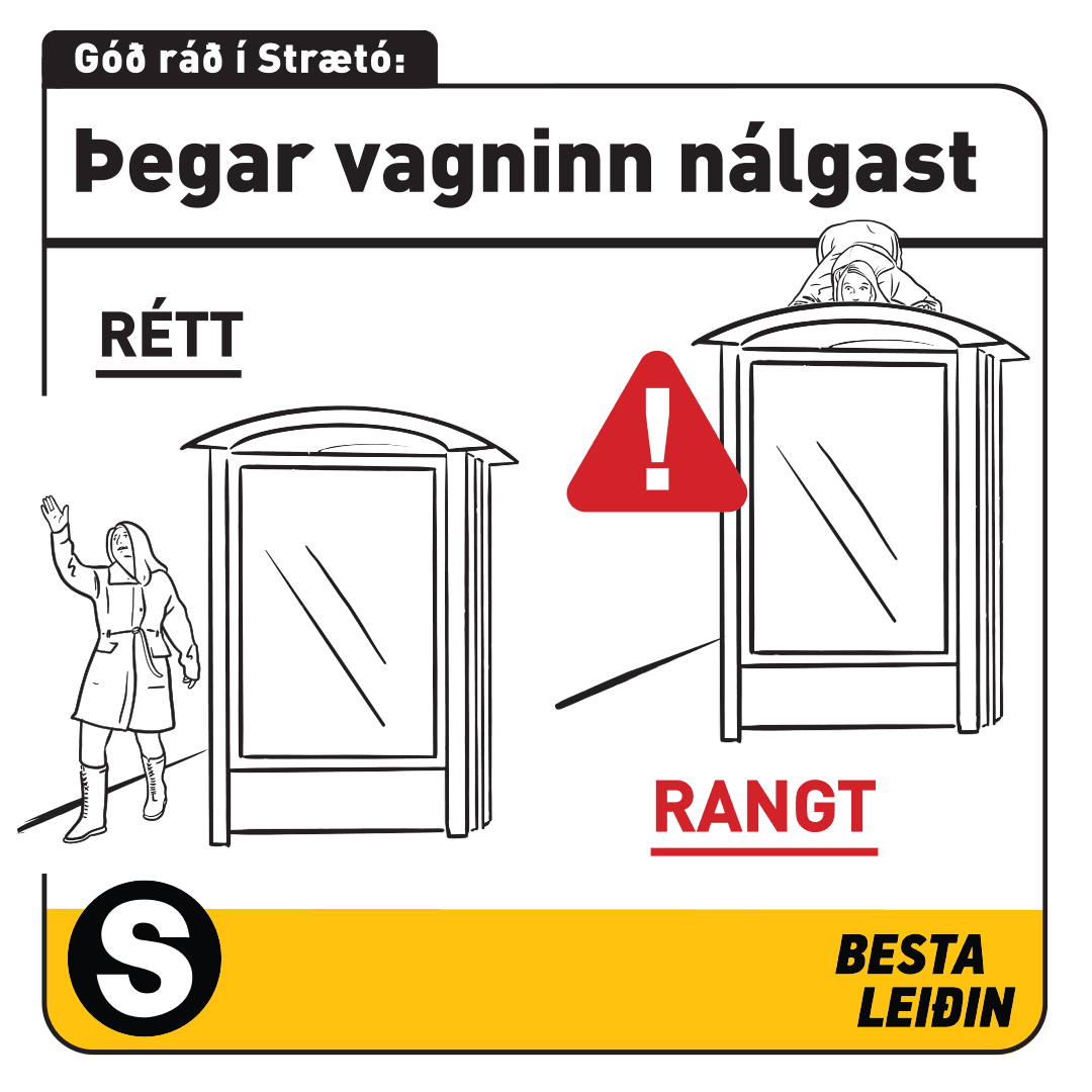 Við mælum með að gera sig sýnilega/n þegar vagninn nálgast biðstöðina. Gott ráð er að stíga út úr biðskýlinu og gefa vagnstjóranum merki.