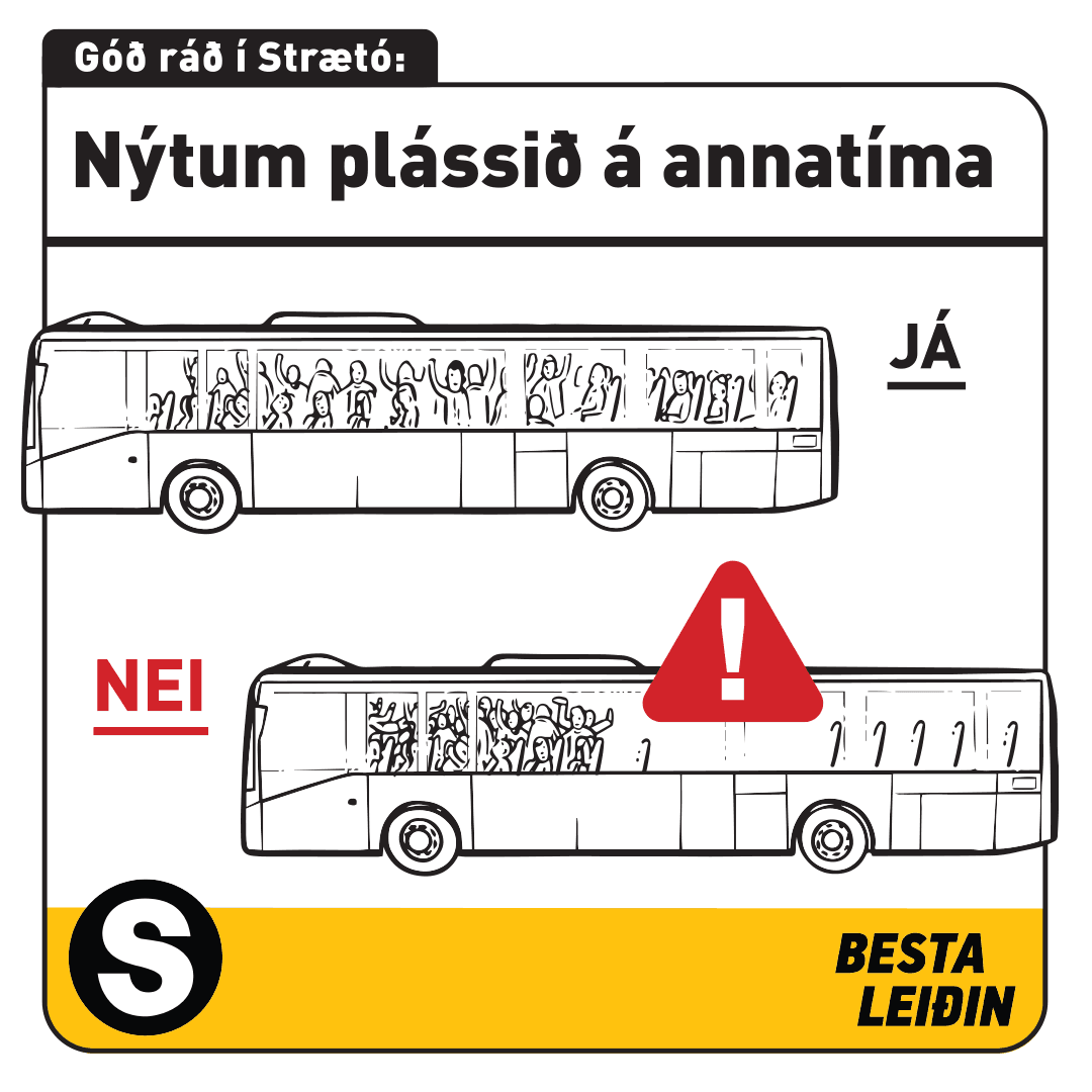 Nýtum plássið á annatíma. Þegar vagninn er að fyllast er nauðsynlegt að dreifa álaginu og færa sig aftar í vagninn.