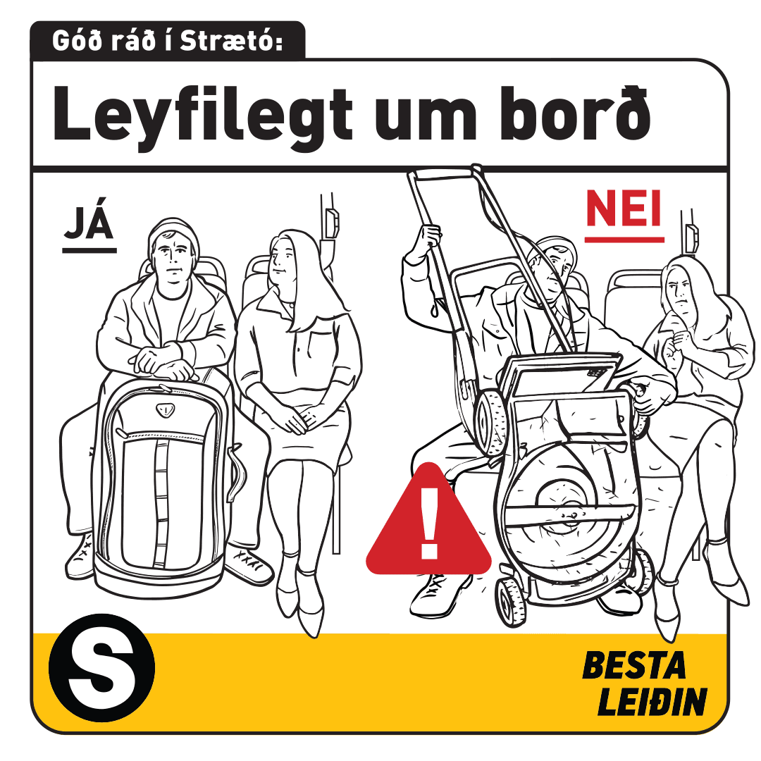 Hvað má taka með sér um borð? Meginreglan er sú að farþegi á að geta borið hlutinn einn síns liðs og að hluturinn megi ekki valda öðrum farþegum óþægindum eða skíta út vagninn.