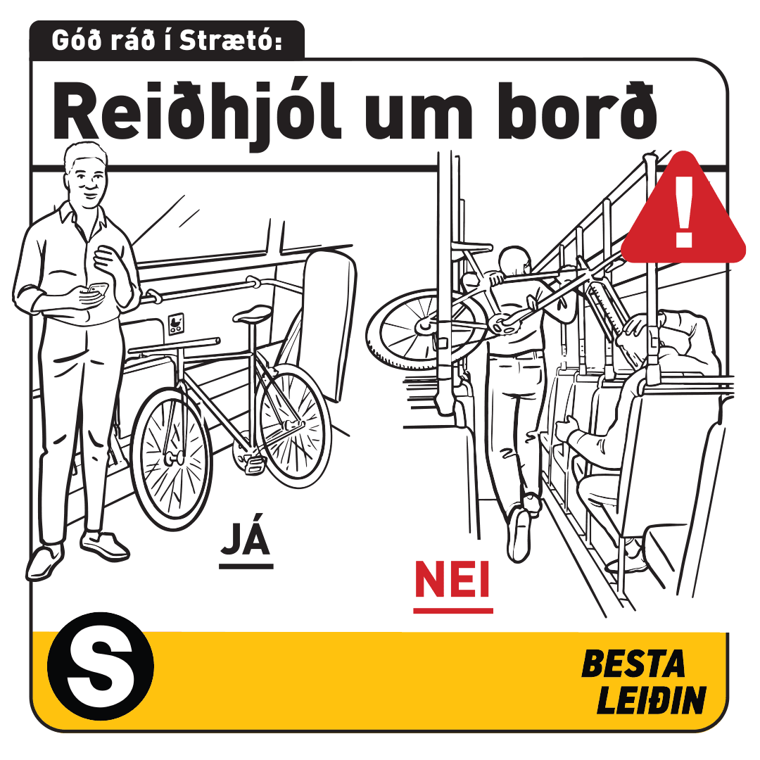Reiðhjól eru leyfileg um borð í Strætó ef pláss leyfir. Sérstakur staður er fyrir reiðhjól, kerrur, vagna og hjólastóla í miðju vagnsins.