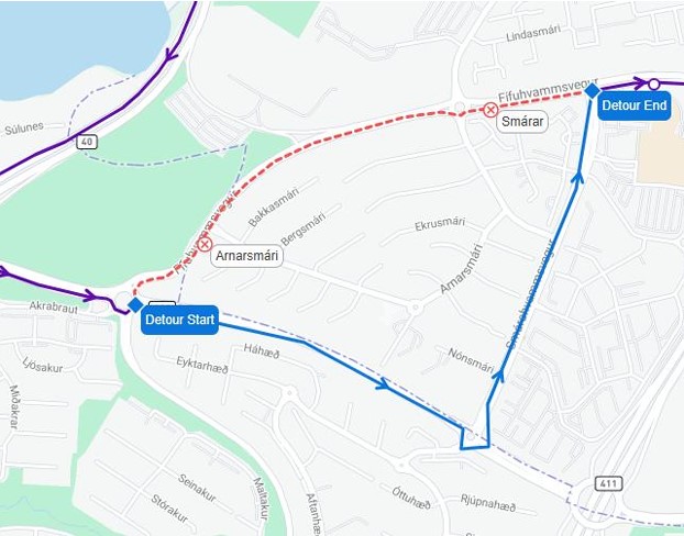 - Route 2 will operate on a detour via Arnarnesvegur and Smárahvammsvegur, stopping at all bus stops along the detour.